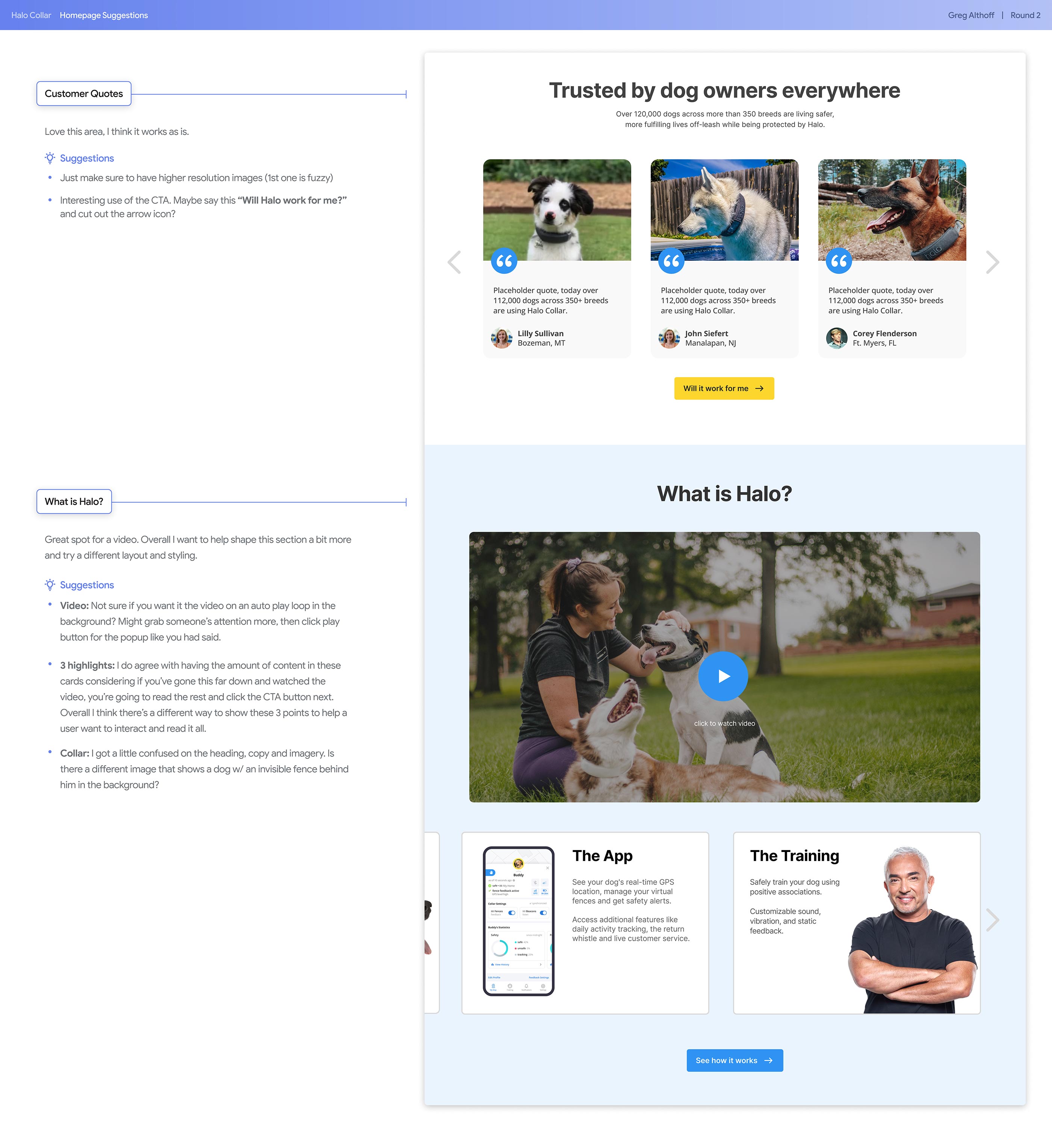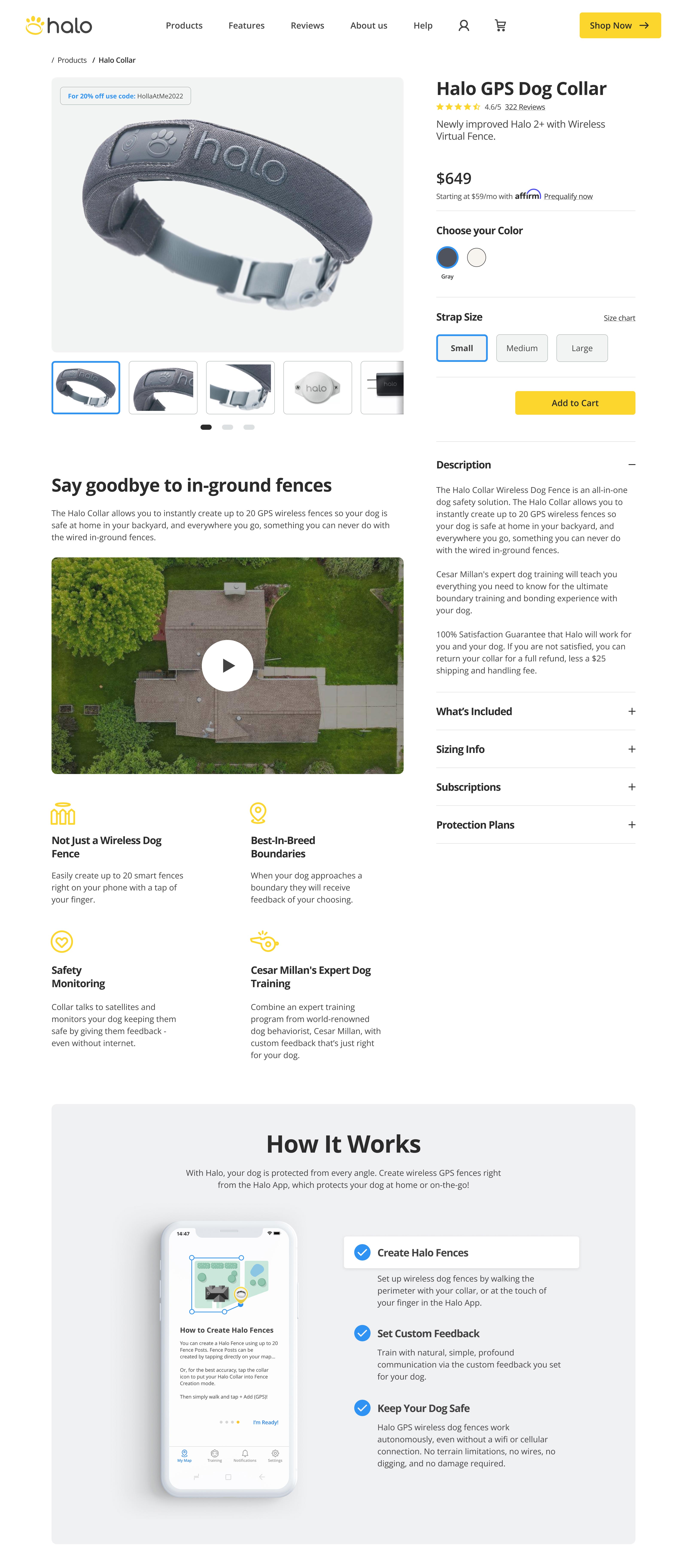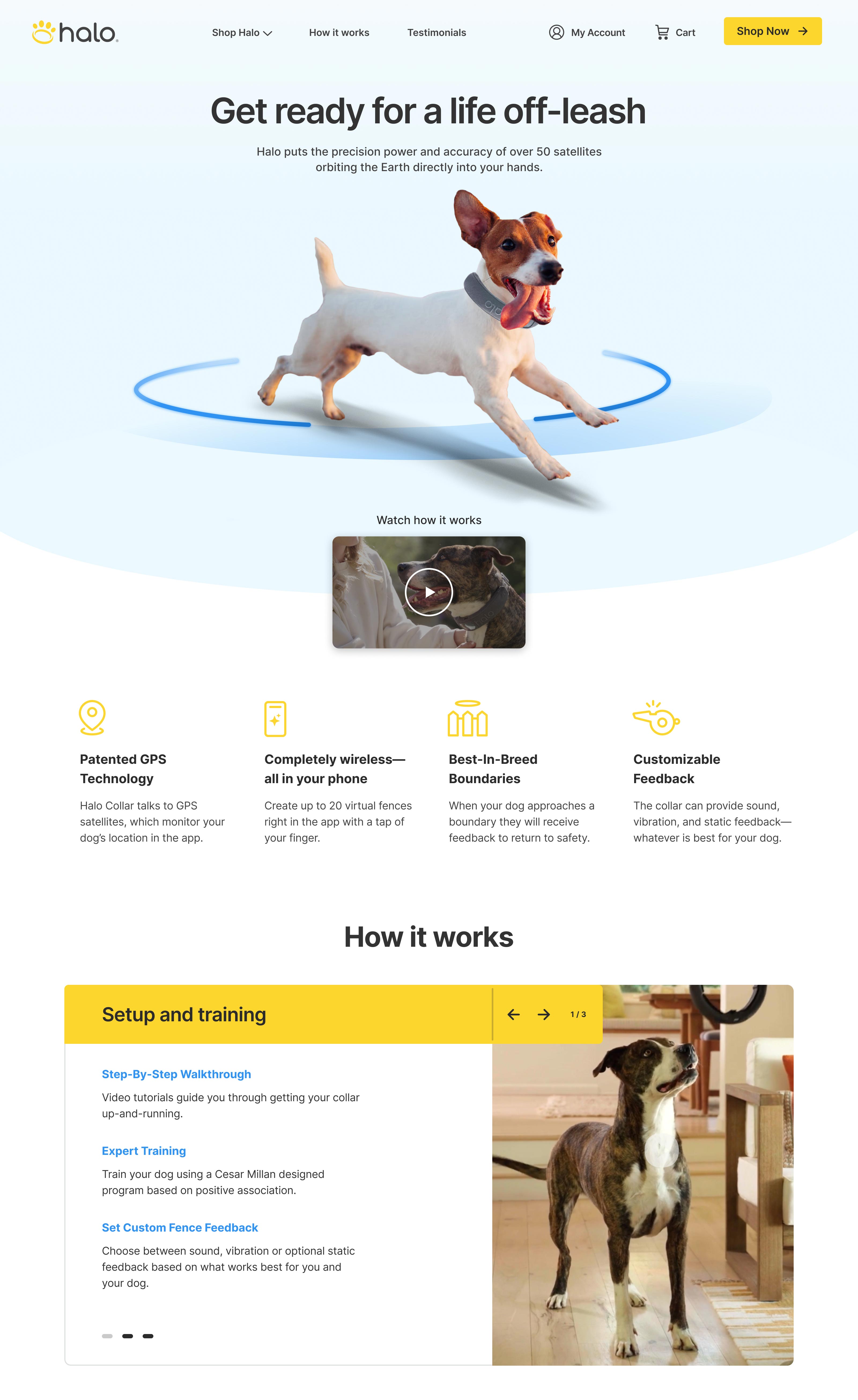 Collaborated closely with Halo Collar's VP of Design to spearhead the art direction and full redesign of their website, delivering vibrant, high-impact comps that amplified the brand's mission in GPS-powered dog safety and virtual fencing. Provided an array of innovative options for every site section—from dynamic product showcases highlighting the Halo Collar 5's precision tracking and activity monitoring to engaging storytelling elements that underscore co-founder César Millán's vision for off-leash freedom.