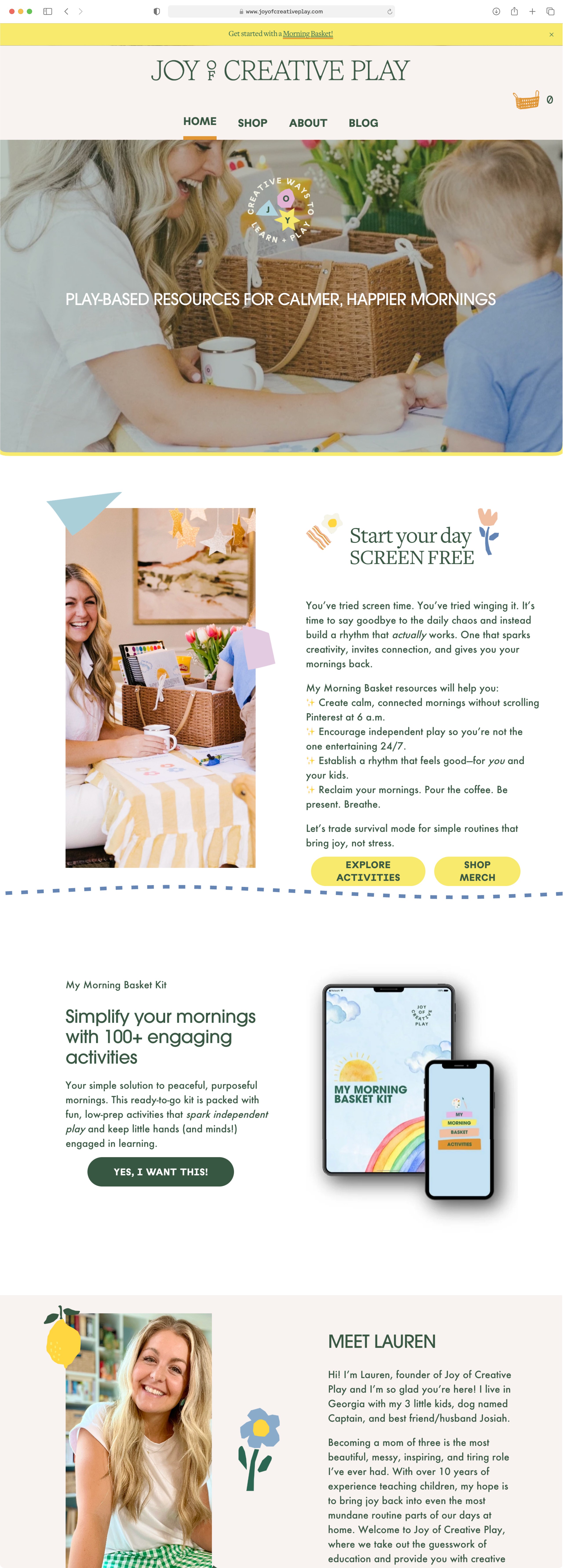 For Joy of Creative Play, a fast‑growing brand with over 230,000 Instagram followers, I built a playful, colorful website that brings Lauren’s Morning Basket philosophy to life.